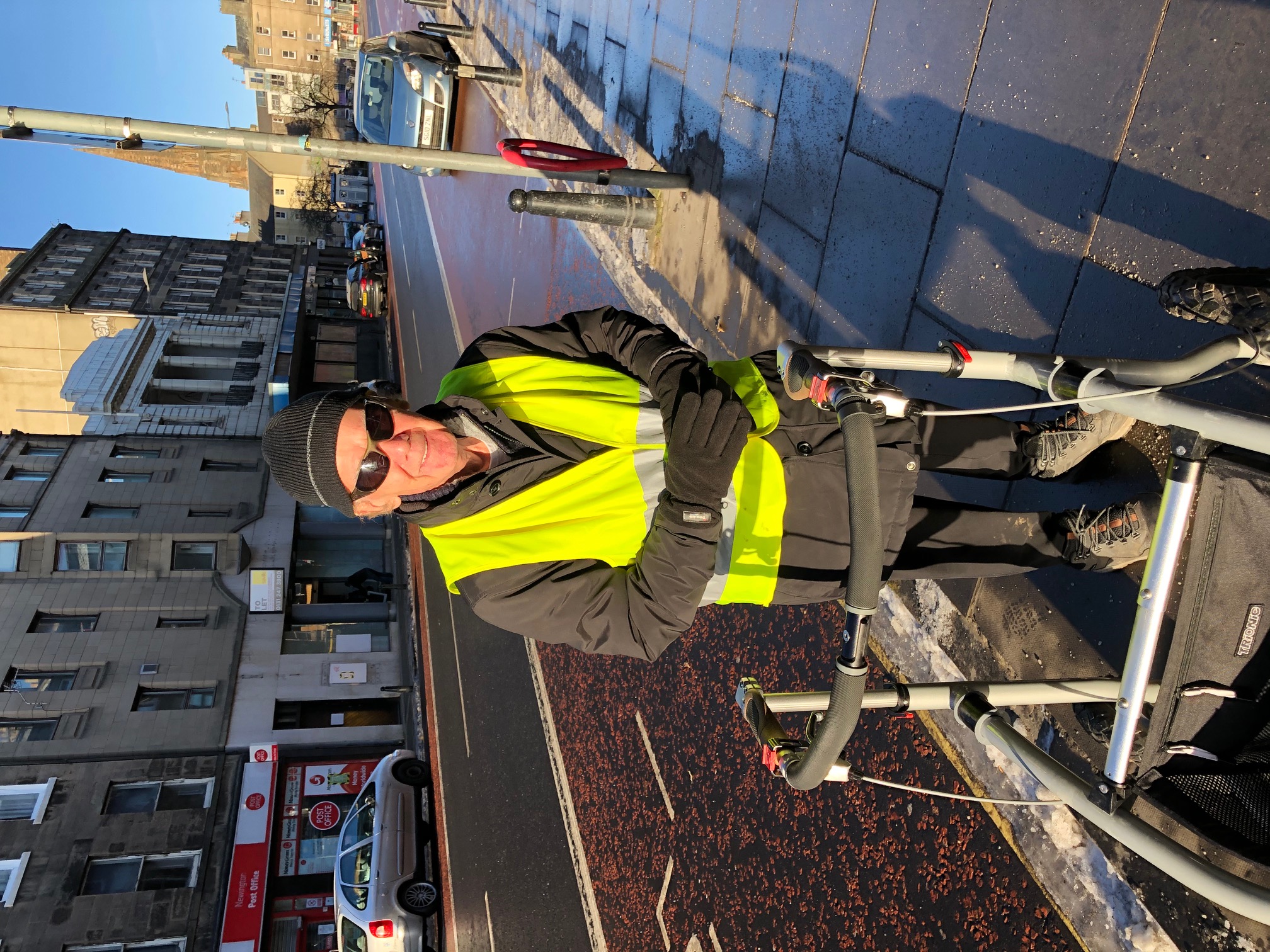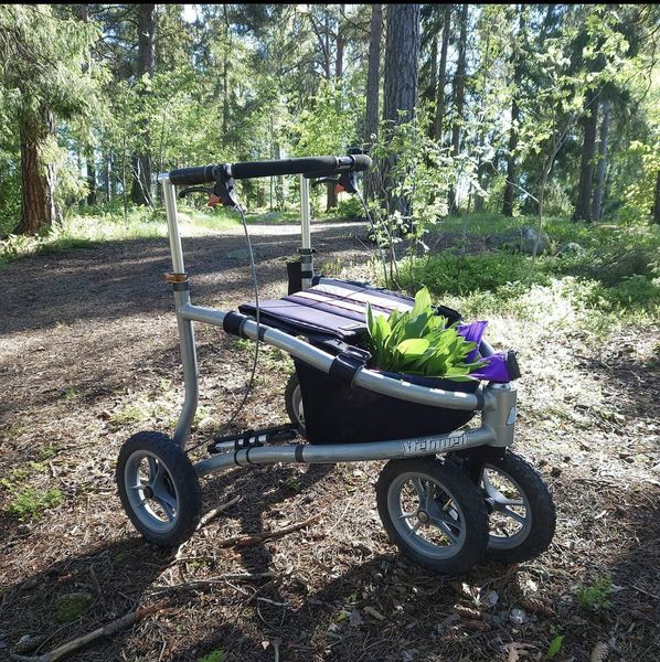 Den er lett å manøvrere, stabil, laster mye og den ser kul ut. Jeg har prøvd andre rullatorer med punkteringsfrie dekk, men får muskelsmerter i armene av dem. Det får jeg ikke med de luftfylte dekkene til Veloped. Rullatoren fungerer utmerket i skoge…