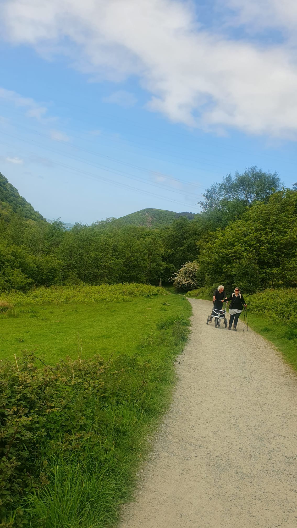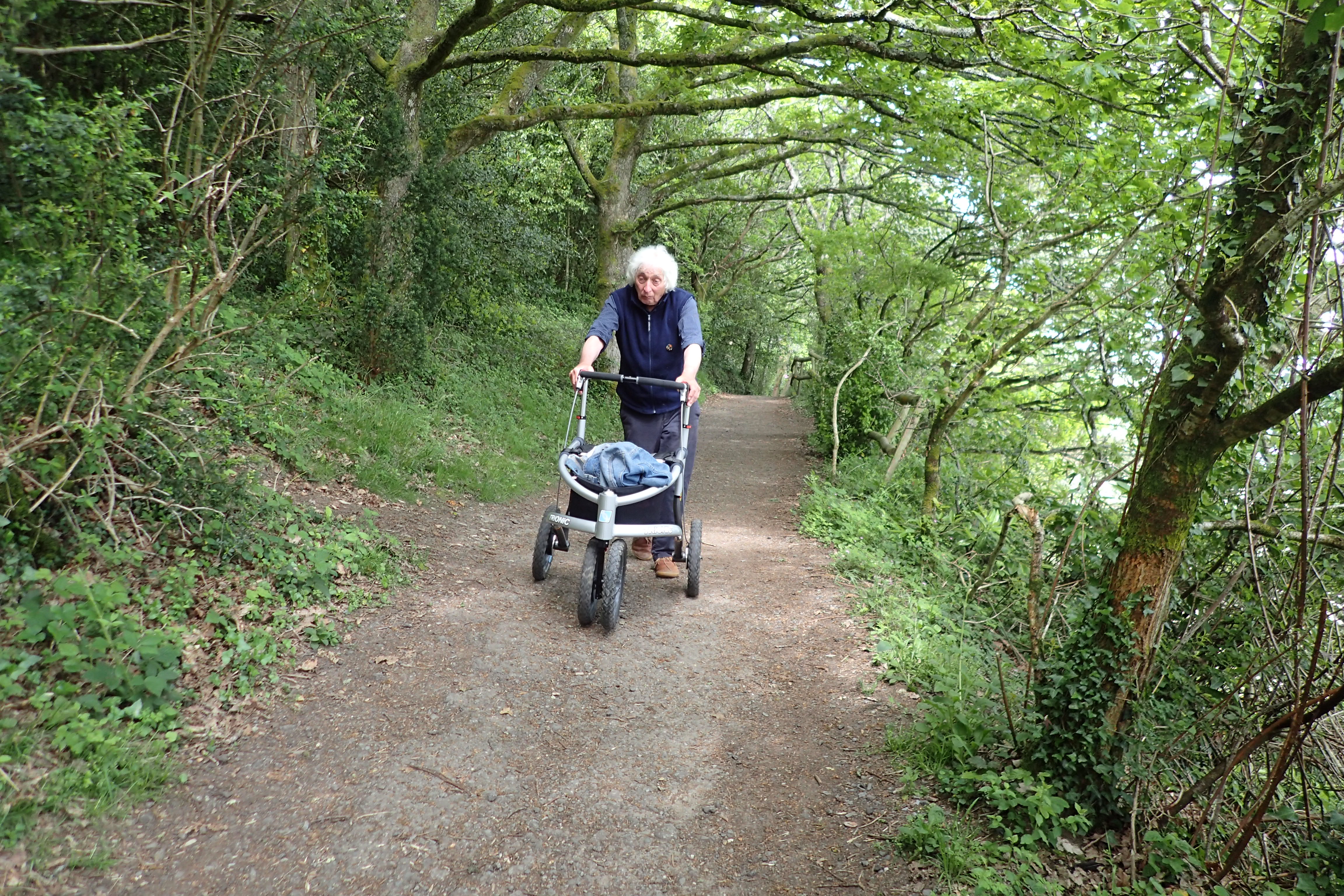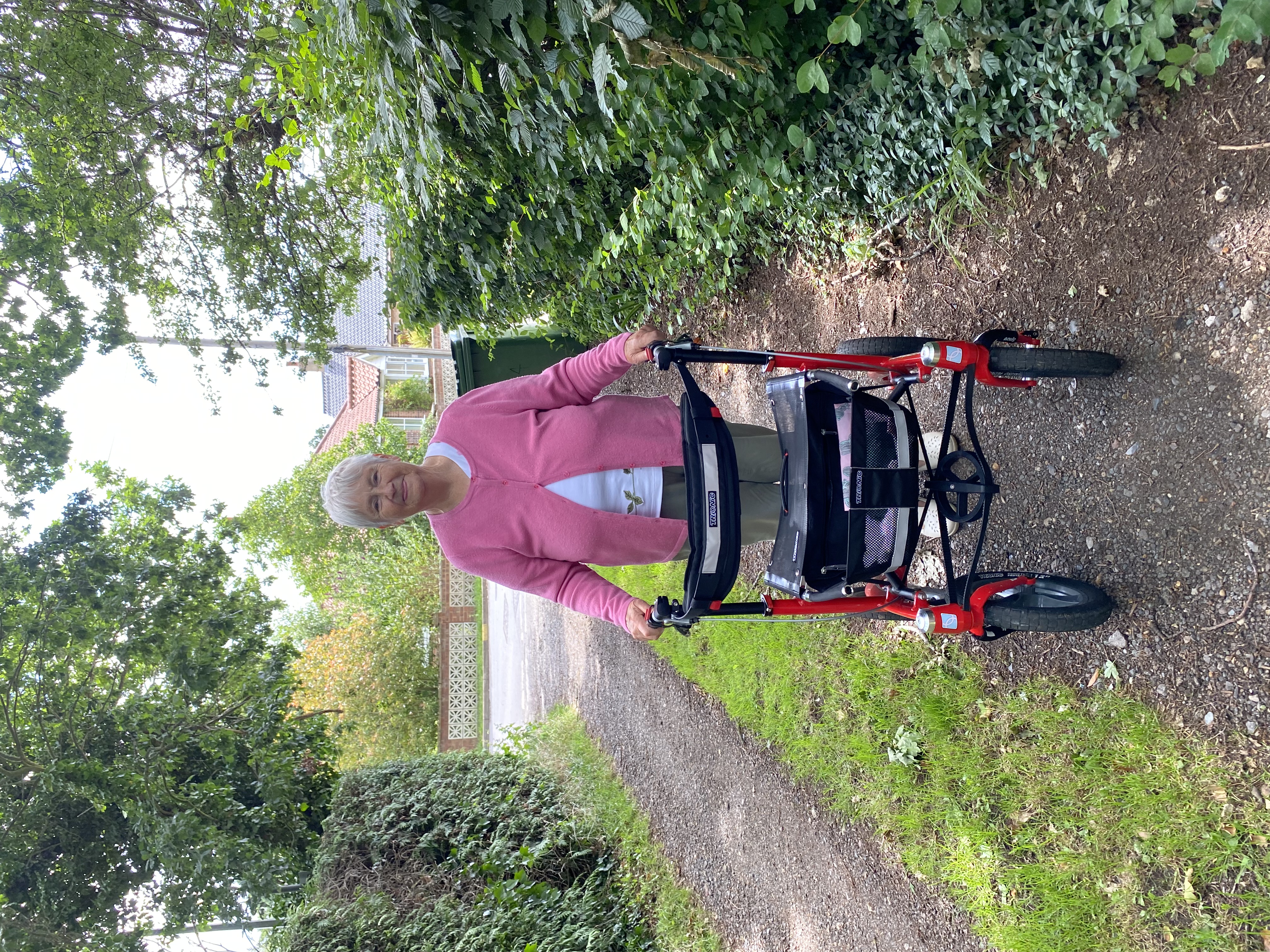 Nå har jeg hatt velopeden i en uke, og ser at den gjør meg i stand til å gå oppreist ganske raskt. Den håndterer den grusbelagte oppkjørselen veldig bra, gresstustene og den humpete landeveien der jeg bor. Hvis jeg møter en kompis, får jeg støtte mens jeg står og prater.